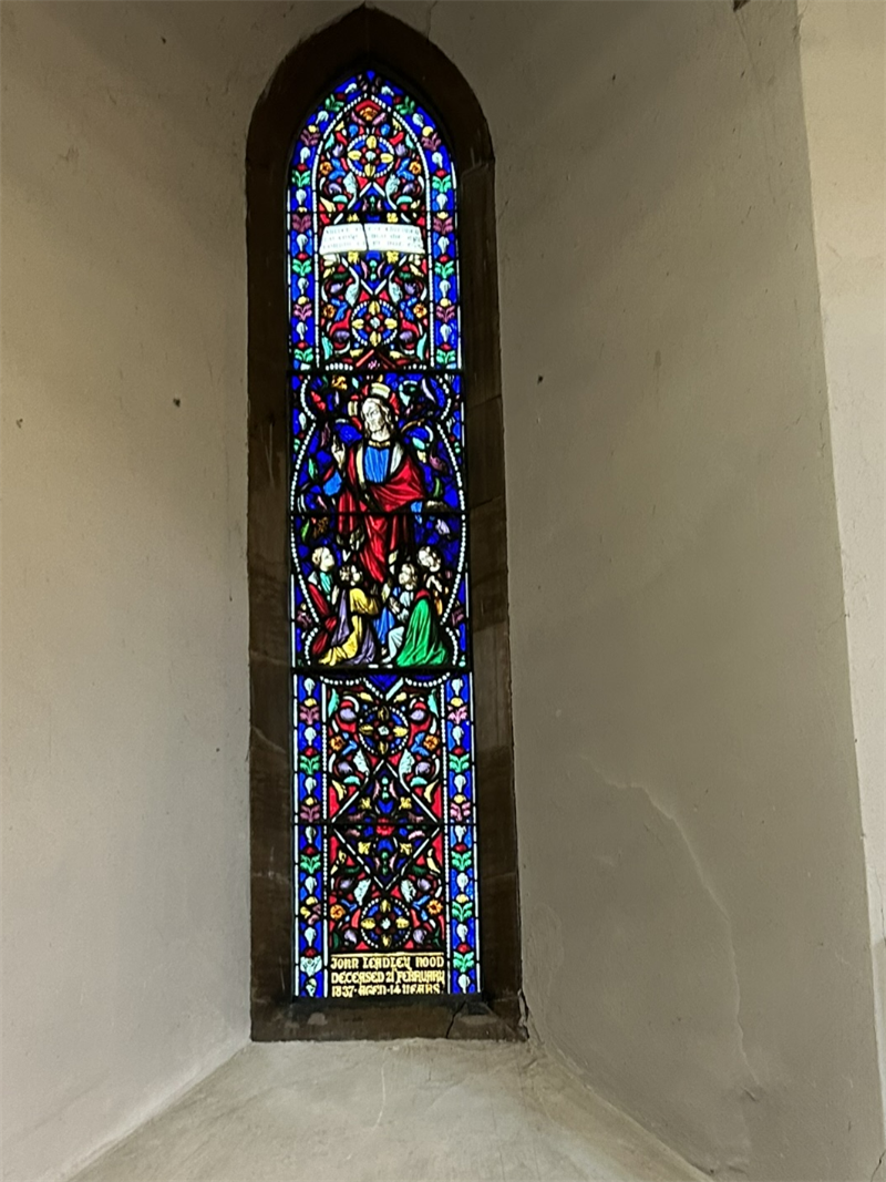 Just inside the main door is found a window (above left, please click on it to see a larger version and some more information) which depicts Jesus blessing the children.