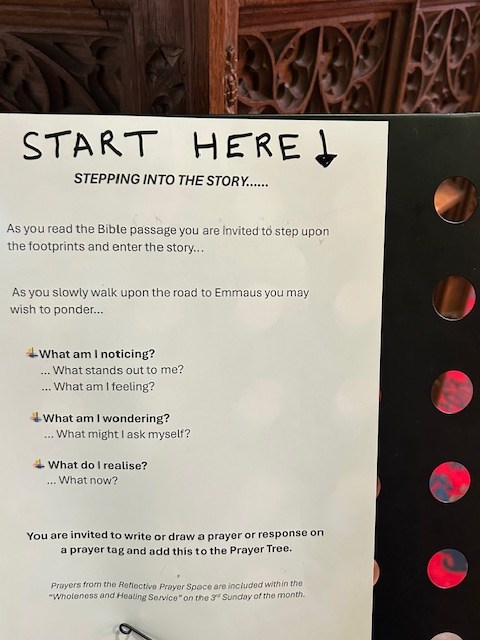 "I can only speak for myself when I say that it can be so easy to get caught up in the busyness of everyday life! Finding a quiet space, away from distractions, to stop and catch my breath with God is sometimes difficult. Whether you find this is the case for you or not, you are invited to "come...be still...and rest" in the reflective prayer space. You are welcome whether it is for a minute or longer." (Anne-Marie who helped develop the idea of the area)